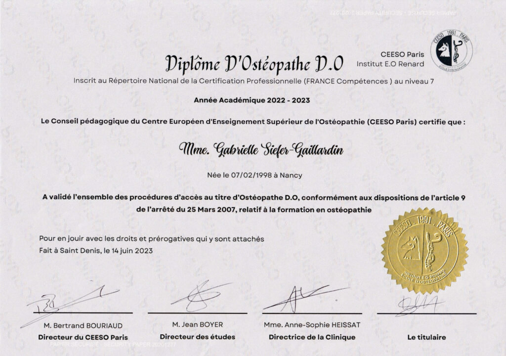 5 années et plus de 4900 heures de formation inscrite au RNCP1 (répertoire de la certification professionnelle au niveau 1), le plus haut niveau de formation en ostéopathie.